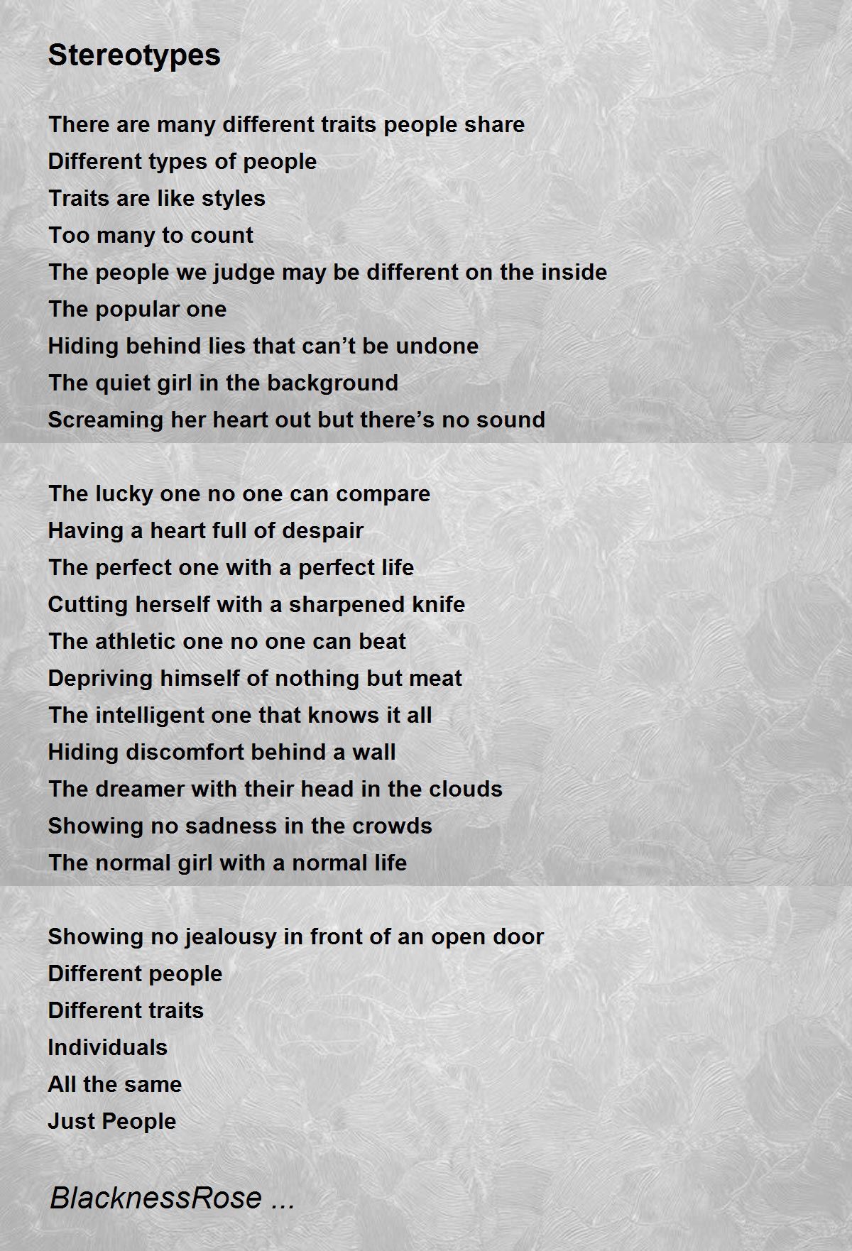 Write the World - Stereotypes - A slam poem. They assign labels. Labels that instead of define, degrade. You're black, so you must be a criminal. You're gay, so you must have aids. You're an atheist, you must be hateful. You're a teenage mother, so you must be an irresponsible slut. Right? You're a jock, so you must be dumb. You're single, so you must be ugly. Reflections - Stereotypes - Weebly 3) This poem made me feel determined and that I can stand up for myself, anyone, or any stereotype. No matter the situation you can be powerful. 4) This poem reminds me of the constitution because the founding fathers were determined to establish rights and freedoms. They also took charge of the situation and were determined and powerful. Poem : "STEREOTYPES" Acrostic - Poems And Quotes "STEREOTYPES" Acrostic by paulina.♥ Apr 1, 2005 category : Miscellaneous / Misc. poems Silly labels, made to Terrorize. Acting Extreme just to Reveal to Everyone that you are Open and can fit in. I’m Trapped in a label that You’ll never understand. People all around me, acting Emotional just So they can get in. report violation Add to