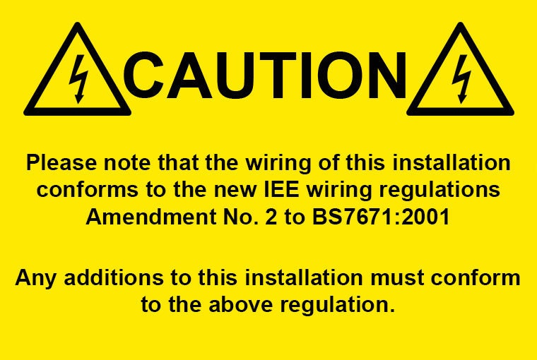 Wiring To BS 7671:2001 - Amendment 2 - Electrical Warning Labels / Stickers. 76mm x 51mm. For Internal use.