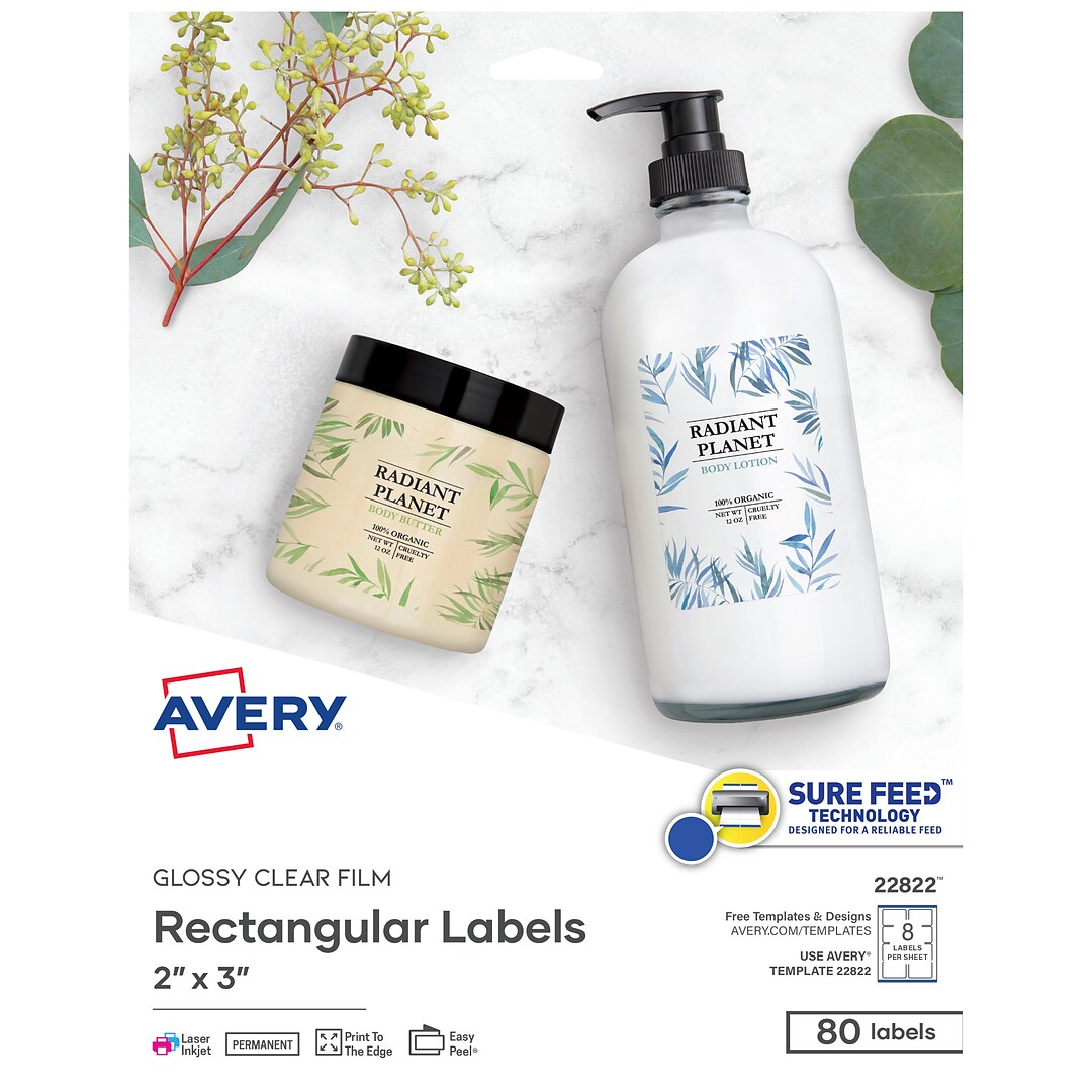 Avery Easy Peel Laser/Inkjet Specialty Labels, 2" x 3", Glossy Clear, 8/Sheet, 10 Sheets/Pack (22822)