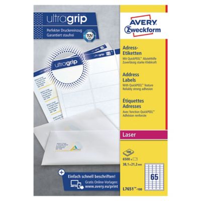 Avery Mini Laser Lbls 38x21mm WH L7651-100 65 p/sheet PK6500 Avery Mini laser address labels are ideal for return addressing. If you have dozens of jobs to be getting on with, mailings and mail-merges are made easy with Avery, these labels are easier to peel and faster to apply with the unique Quick Peel™ feature, to save you time and effort. ... Avery Mini Laser Lbls 38x21mm WH L7651-100 65 p/sheet ...